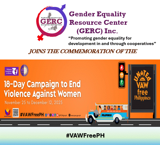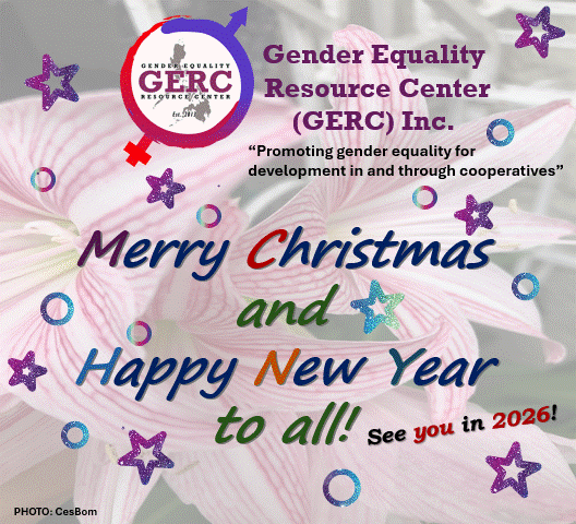 The Gender Equality Resource Center (GERC) Inc. welcomes everyone to this website, launched March 2017. The GERC Inc. website is a venue for co-ops and organizations that support co-op development, particularly in the Philippines where the GERC Inc. is based, to learn more on how the mainstreaming of gender and development (GAD) in co-ops that leads to the achievement of gender equality (GE) can help these organizations become even more progressive and their members even more empowered. And that learning, we hope, should come hand-in-hand with the commitment of co-ops, co-op promoting organizations, development agencies, local government units, and government agencies to make co-ops and other development institutions gender-fair and gender-sensitive.