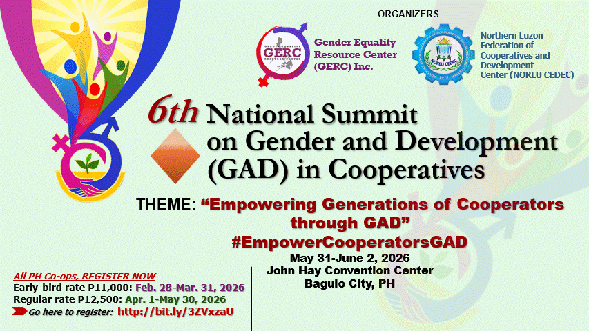 ALL Philippine co-ops, and other private and government organizations that support co-op development in the country! Register now and join the "6th National Summit on Gender and Development (GAD) in Cooperatives" on May 31-June 2, 2026, John Hay Convention Center, Baguio City!!!