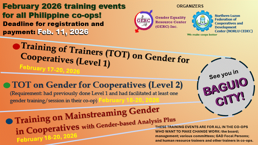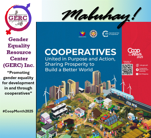 The Gender Equality Resource Center (GERC) Inc. welcomes everyone to this website, launched March 2017. The GERC Inc. website is a venue for co-ops and organizations that support co-op development, particularly in the Philippines where the GERC Inc. is based, to learn more on how the mainstreaming of gender and development (GAD) in co-ops that leads to the achievement of gender equality (GE) can help these organizations become even more progressive and their members even more empowered. And that learning, we hope, should come hand-in-hand with the commitment of co-ops, co-op promoting organizations, development agencies, local government units, and government agencies to make co-ops and other development institutions gender-fair and gender-sensitive.